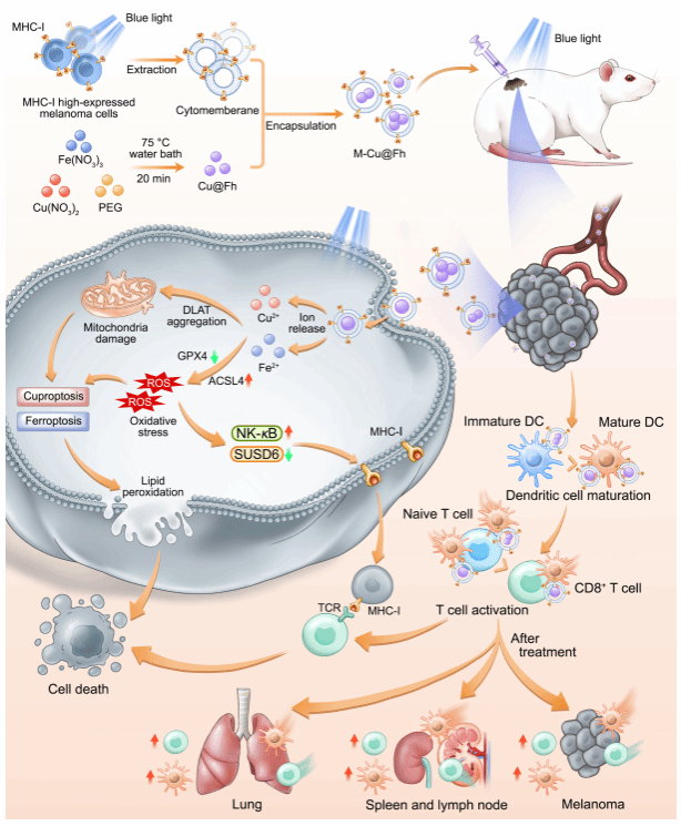 为此,张连兵教授团队首次发现蓝光能够通过调控NF-κB-SUSD6信号轴显著上调黑色素瘤细胞MHC-I的表达,从而增强其免疫原性,使黑色素瘤细胞更易被免疫细胞(如树突状细胞和巨噬细胞)识别和攻击。基于此发现,研究人员巧妙设计并合成了一种新型纳米颗粒M-Cu@Fh。该颗粒以蓝光响应性的Cu@ferrihydrite(Cu@Fh)为核心,外层包覆了富含MHC-I的黑色素瘤细胞膜。在蓝光照射下,M-Cu@Fh可控制性地释放Fe⟡⁺和Cu⟡⁺,在肿瘤细胞内引发强烈的氧化应激并诱导线粒体功能紊乱,从而导致黑色素瘤细胞的铁死亡(Ferroptosis)和铜死亡(Cuproptosis)。更为重要的是,M-Cu@Fh的MHC-I分子能有效促进树突状细胞成熟和巨噬细胞抗肿瘤极化,继而激活CD8⁺和CD4⁺ T细胞,启动有效的抗肿瘤免疫应答。动物实验表明,该联合疗法不仅能显著抑制原位黑色素瘤的生长,还能在淋巴器官和肺部激活系统性的免疫记忆,有效阻止肿瘤的远端转移,展现出类似“肿瘤疫苗”的预防效果。该研究不仅首次阐明了蓝光通过NF-κB-SUSD6轴调控MHC-I的分子机制,更构建了一个集光动力疗法(Photodynamic therapy,PDT)与光免疫疗法(Photo-immunotherapy,PIT)于一体的协同治疗平台,为癌症的联合治疗与转移防控开辟了新的途径。